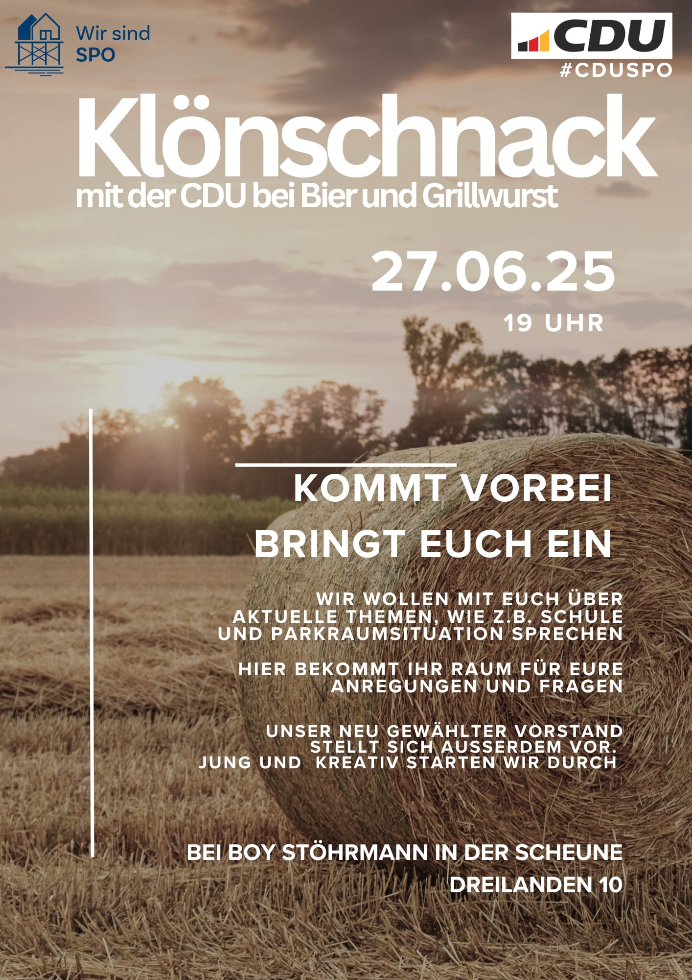 Am 27.06.25 Uhr lädt der neu gewählte Vorstand des Ortsverbandes der CDU SPO zum Klönschnack ein.