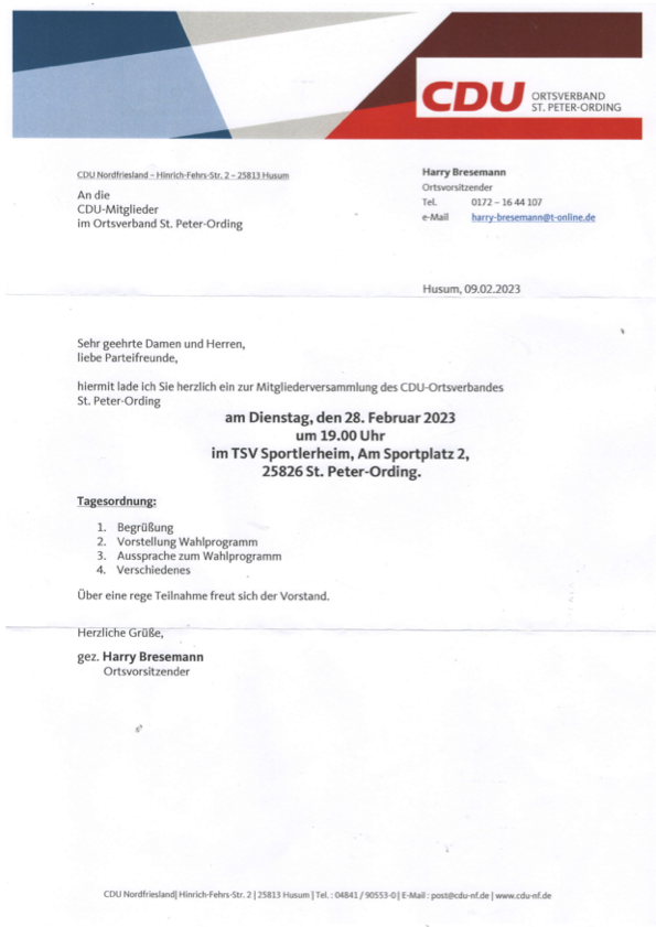 Unser Ortsvorsitzender Harry Bresemann lädt im Namen des Vorstandes alle CDU-Mitglieder im Ortsverband St. Peter-Ording ein am